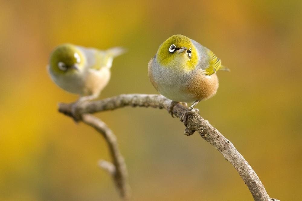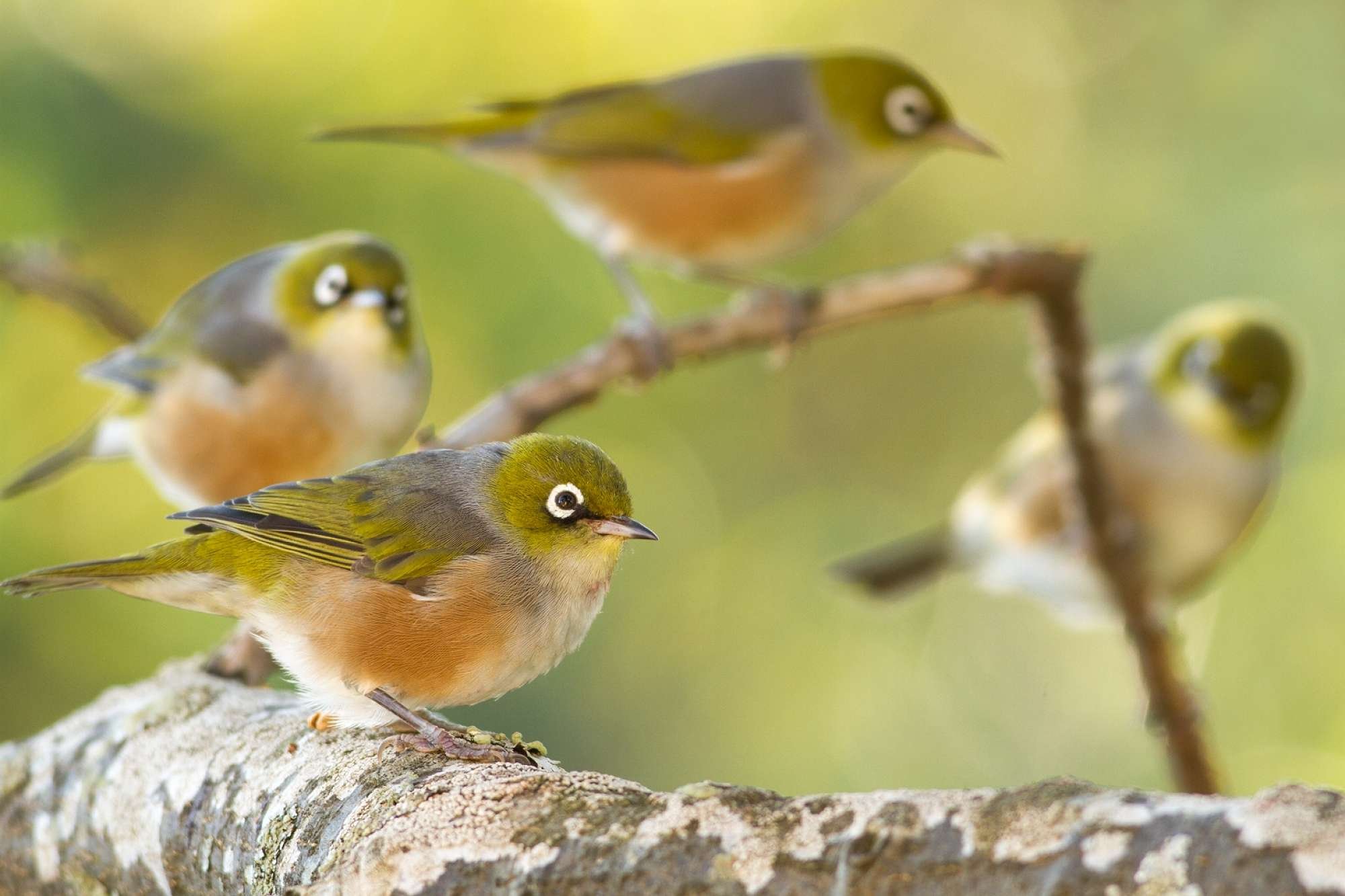 My fantail was shot against a screen of leaves backed by the low evening sun, creating pinpoints of light that show up in the image as attractively diffused highlights. And the silvereye pair was photographed late last autumn, with the same foliage now transformed into an orange–red blur.