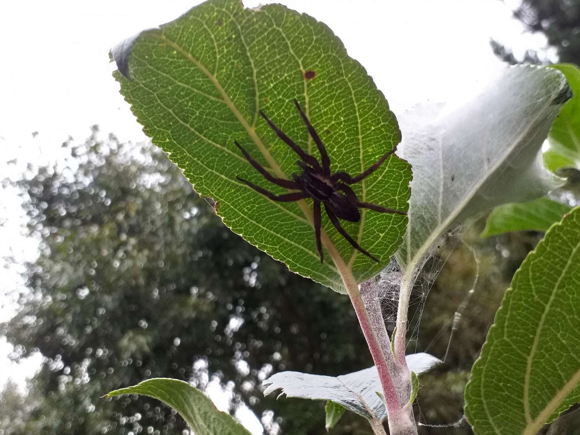 Nursery web spider out on the underside of an apple tree leaf. Image by: Jeannie Hayden