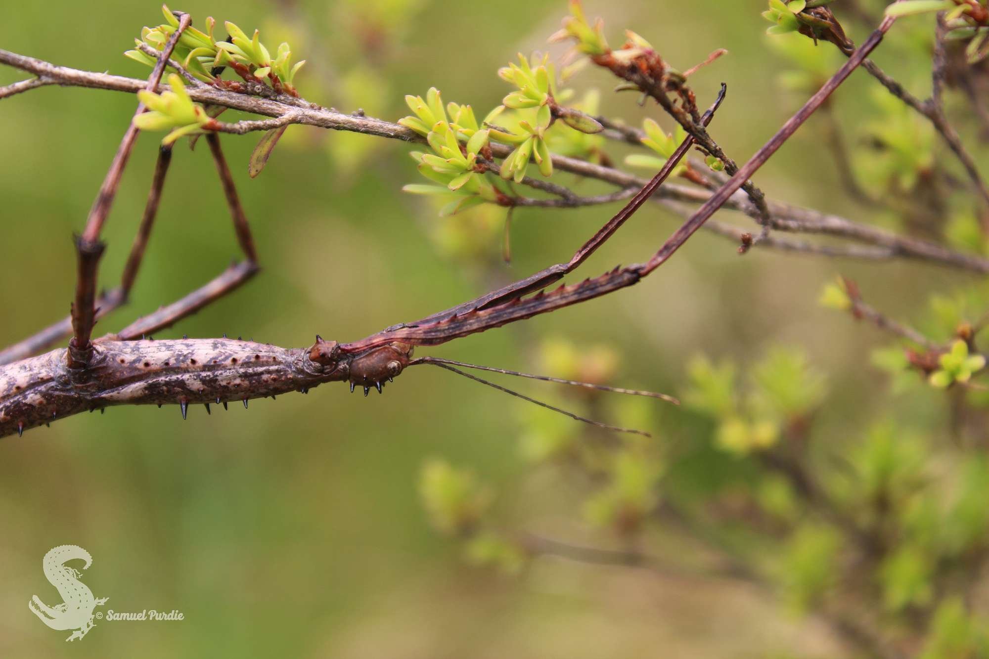 Pictured is a species of native stick insect from the Acanthoxyla genus. Image by: Samuel Purdie